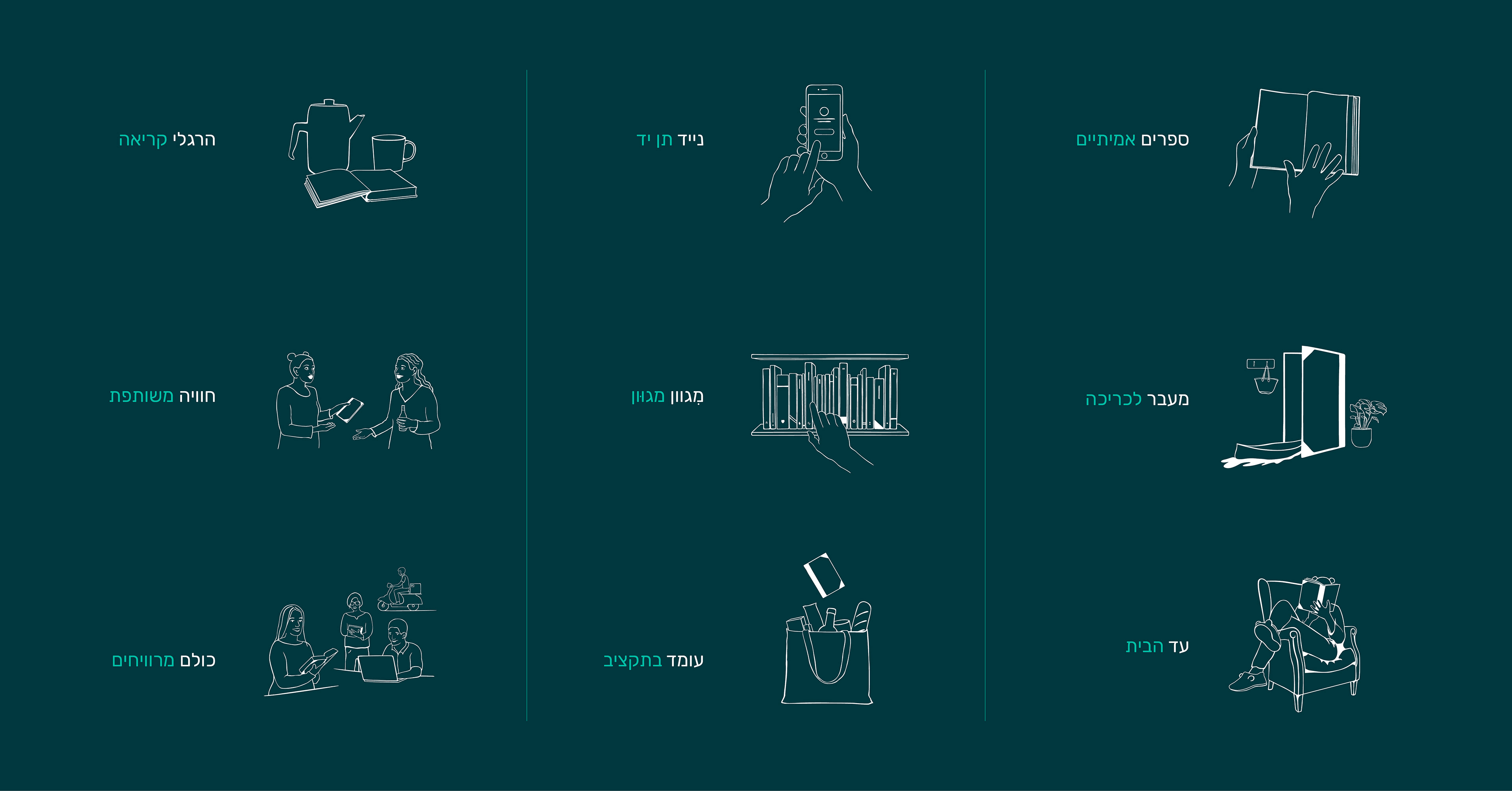 As part of defining our product character, we identified 9 values that represent realbook vision. We meet our readers in various ways - from the book itself, through its packing, to the app. Each of these interactions is supported by realbook unique visual language, resonants realbook values. More about realbook values in our webpage (includes beautiful animation made by Elisheva Kessel to my illustrations)